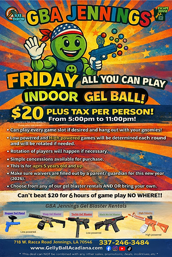 Friday All You Can Play Gel Ball Game play (INDOORS only)! $20 plus tax per person. From 5:00pm to 11:00pm! *Individual games are still open to book/ walk in as well* Can play every game slot if desired and hang out with your gnomies! Low powered and High powered games will be determined each round and will be rotated if needed. Rotation of players will happen if necessary. Simple concessions available for purchase. This is for ages 5 years old and up. Make sure waivers are filled out by a parent/ guardian for this new year (2026). Choose from any of our gel blaster rentals and or bring your own. Can't beat $20 for 5 hours of game play NO WHERE!!! Convenience fee may apply if using card.